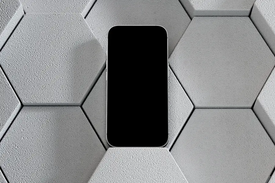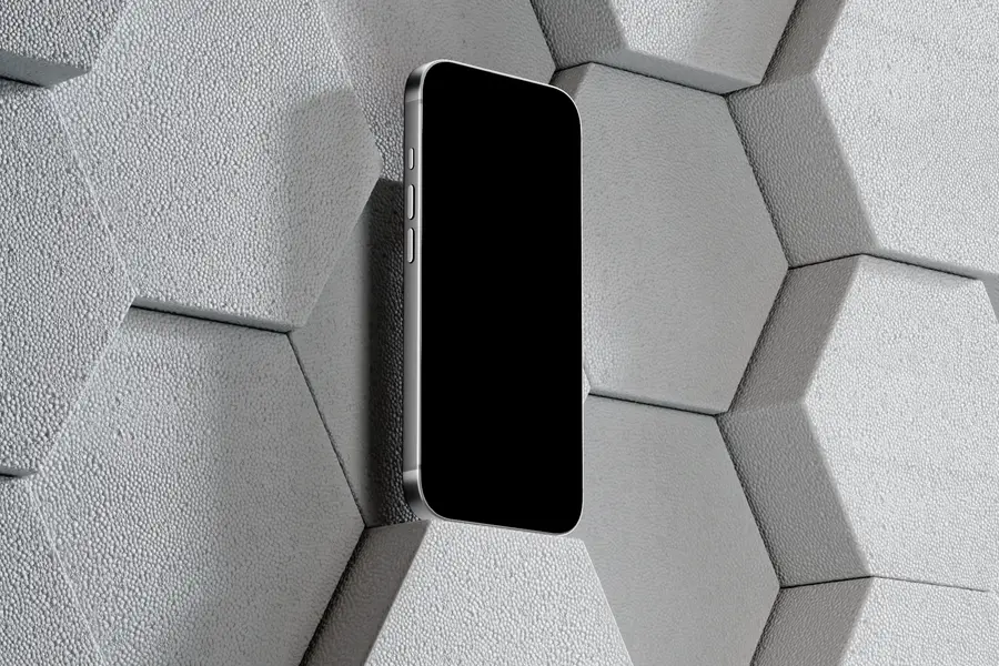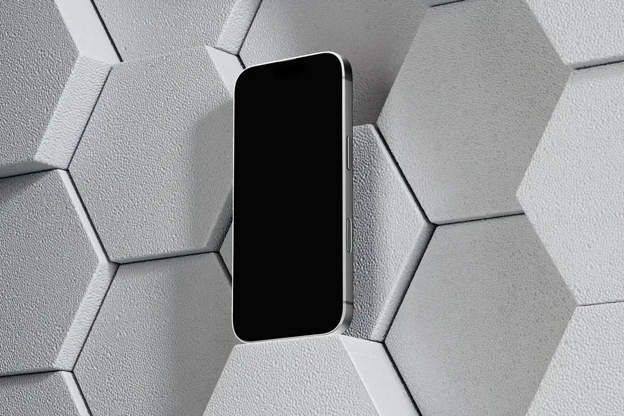 Showcase your interface against a sculpted hex-panel polystyrene wall with a fine, matte texture. This free, browser-based generator places the iPhone 17 Pro in a clean, lightweight, design-lab setting—ideal for modern UI case studies, product pages, and brand visuals with a geometric touch.